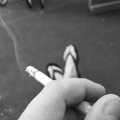 Keywords: cigarette smoking break ash embers smoke tobacco cigarette end nicotine smokers corner unhealthy tilt man flip flops depth of field hand black white addiction drugs dependency consumption be cool dependent public feet