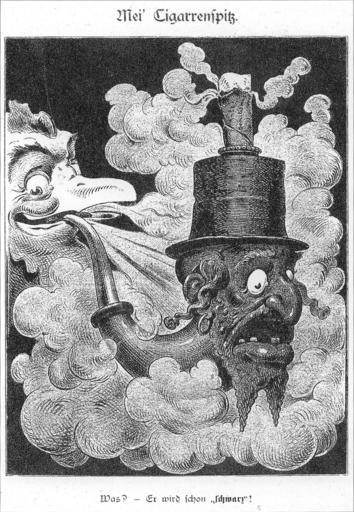 | Keywords: Cigarrenspitz.jpg Caption from the source At the close of the nineteenth century the Viennese anti-Semitic periodical Kikeriki represented the black face of the Jew as a cigar holder with the contradictory images of the traditional religious sidelocks with the top hat of the modern city dweller The Jew is in pain because of the cock's attention 'Kikeriki' is the sound that a German rooster makes Smoke a global history of smoking 2004 edited by Sander L Gilman and Zhou Xun ISBN 1-86189-200-4 p 281 late 19th century Smoking men in art Antisemitic pictures Smokers pipes in art Animals acting as humans in art Kikeriki PD-Art |