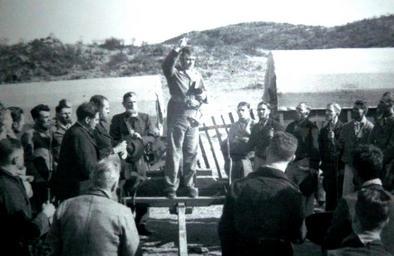 Keywords: Cilliers-gelofte, 1938-film, Die bou van 'n nasie.jpg Uitbeelding van Cilliers se voordrag van die gelofte voor die sowat 400 voortrekkers op 9 Des 1838 aan die Wasbankrivier wat elke aand daarop bevestig is tot die 15de toe Dingaan se impies om die laer saamgetrek was In 1938 het die Suid-Afrikaanse Spoorweë se publisiteitsafdeling Die bou van 'n nasie / They built a nation vervaardig met o m Myles Bourke as Piet Retief en toneelspelers van die Volksteater-toneelgroep Die regiseurs was Joseph Albrecht en A A Pienaar <br> Cilliers sou in sy Joernaal skryf ek het in my swakheid voldoen aan die begeerte van al die amptenare ook wis ek dat die meerderheid burgers daarvoor was op 'n kanonwa is die gelofte voorgedra op 'n eenvoudige wyse so plegtig as die Heer my daartoe in staat gestel het en Reenactment of the vow taken by Cilliers and some 400 voortrekkers on 9 Dec 1838 at the Wasbank River and confirmed every evening up to the 15th when the enemy was in view In 1938 the South African Railways and Harbours public relations department produced Die bou van 'n nasie / They built a nation which included Myles Bourke as Piet Retief and actors of the Volksteater-toneelgroep The directors were Joseph Albrecht and A A Pienaar <br> Cilliers would recall in his memoirs I conceded in my weakness to the wish of all the officials also was I aware that the majority of burghers were in favour of it on a canon wagon was the vow delivered in a simple way with as much dignity as the Lord enabled me to do From display in Voortrekker Monument Museum South African Railways and Harbours public relations department Original 1938 PD-old-70 PD-US-not renewed Sarel Cilliers Day of the Vow Photographs by User JMK |
