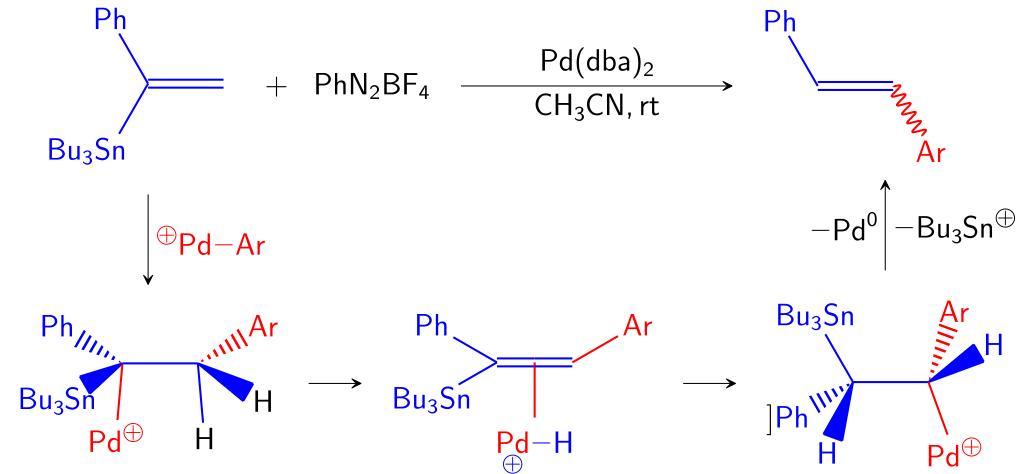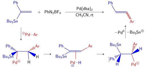 Keywords: Cine Substitution.svg LaTeX and pdf was converted to SVG own Krishnavedala 2014-07-31 validSVG LaTeX source code <syntaxhighlight lang latex > \documentclass12pt border 3pt standalone \usepackageT1 fontenc \usepackageutf8 inputenc \usepackage chemfig chemmacros \usepackage lmodern \usetikzlibrary decorations pathmorphing \chemsetupchemformula font-shape sf format \sffamily \renewcommand \printatom1 \ensuremath \mathsf 1 \setatomsep 2 5em \setdoublesep 6ex \setarrowdefault 75 \setbondstyle thick \begin document \schemedebug false \schemestartwest \chemfigblue Ph- -60 - -60Bu_3Sn \;\;\; \arrow 0 0\+ \chemfig PhN_2BF_4 \arrow ->\ch Pd dba _2 \ch CH_3CN \ rt 2 2 \chemfig blue\color blue Ph - -60 - -60 red decorate decoration snake segment length 4pt\color red Ar \arrow c1-- -> 0\color red \ch \fpch Pd-Ar -90 1 \chemfig blue\color blue Ph > -30 < -120\color blue \ch Bu3Sn - -95 red\color red Pd\fpch - < -30\ch H - -85\ch H < +30 red\color red Ar \arrow -> \chemfig blue\color blue Ph - -30 - -120\color blue Bu_3Sn 5 -6 red\chembelow \color red Pd \color blue \fpch \color blue \ch -H 5 - +30 red\color red Ar \arrow -> \chemfig blue\color blue Bu_3Sn - -60 < -150\color blue Ph < -110\color blue H - < +30\color blue H < 70 red\color red Ar - -70 red\color red Pd\fpch \arrow c6-- -> 0\ch -Pd 0 0\ch -Bu3Sn \fpch 90 1 \schemestop \end document </syntaxhighlight> cob Chemical reactions Substitution reactions Cc-zero |