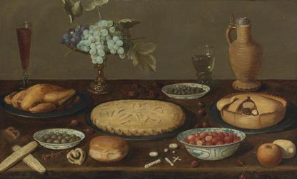 Keywords: Circle of Jacob van Es Still Life with Meat Pies, a Roast Fowl, Olives, Capers and Strawberries.jpg Still life with meat pies a roast fowl olives capers and strawberries in blue and white porcelain bowls a tazza with grapes a Roemer filled with wine a ceramic jug and other items all on a wood table oil on panel 62 by 102 2 cm http //www sothebys com Sotheby's Sale N08952 New York 2013-01-31 “2013-02-01 century 17 circle of PD-art-100 Images from Sotheby's Jacob Foppens van Es still life paintings of food still life paintings of tableware Porcelain tableware in art |