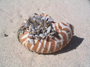 | Keywords: Cirripedians.jpg An unknown species of cirripedian crustaceans in a Naultilus shell Russell Island Great Barrier Reef in 2005 2005-09 Photographed by Muriel Gottrop in September 2005 Nautilus Unidentified Lepas Great Barrier Reef Marine Park |