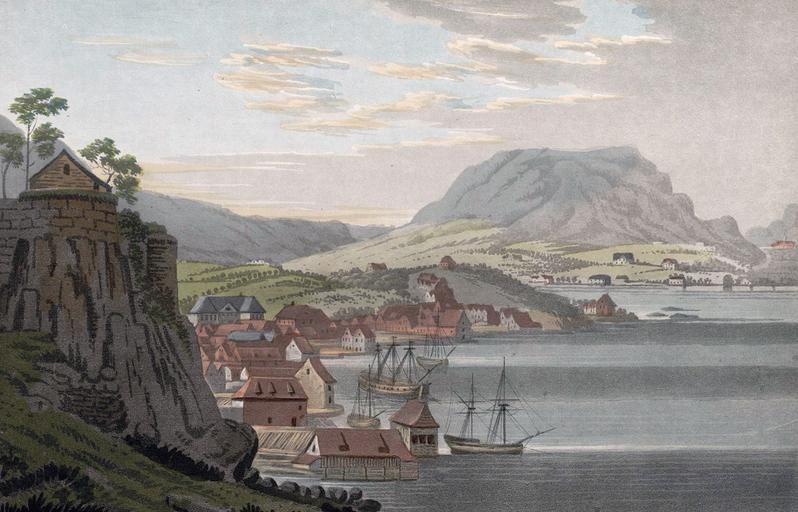 | Keywords: City of Bergen (JW Edy plate 76).jpg Artwork Creator John William Edy en City of Bergen No LXXVI CITY OF BERGEN This view of the city of Bergen was taken on a rock under the walls of the fortifications of the round fort looking over the north harbour towards a rocky mountain which presents a most conspicuous feature on the approach to the town from the sea It is one of those table mountains with nearly perpendicular sides which are peculiar to this part of Norway They are almost inaccessible and afford shelter to birds only Along the shores to the city are many fair houses and wharfs This little harbour being in many parts shallow is not much used by large vessels except when laying up or repairing c The guns of the fort entirely command it This view is a continuation of the country extending to the right of North Bergen and joining that city as seen in plate 77 The high road from Trondheim Drontheim enters it and facilitates a great deal of inland traffic among the mountainous peasantry who are situated in perhaps the most rugged part of the country The way from Bergen to Christiania traverses those vast ranges of mountains called Hardangerfield which intersect Norway The traveller in passing along it finds incessant cause of alarm in the incessant roaring of cataracts rapid rivers with crazy bridges howling of wild beasts screaming of discordant birds and other circumstances of wild desolation There is scarcely a tree or shrub to be seen; in some places the mountains are covered with perpetual snows On a journey through this dreadful region the traveller always ascending or descending barren mountains or rocks and encountering blasts in the vallies seated in an open carriage on the worst road in the universe is kept in continual fear and agitation On arriving on the table height of one of those high mountains a desert plain forty miles in length presents itself about the centre of which a house has been erected by order of the king for temporary protection from savage beasts and for the convenience of shelter to the weary or benighted traveller going over this horrible territory From the intensity of the cold of its climate it is not permanently inhabitable Within the house are only a few benches and hearths The traveller is warned to provide himself with victuals flint steel fuel and provender for his horses and dogs On his arrival he finds the key in the key-hole outside of the door which he is required to unlock and place in the same direction on leaving the place for the next corner Strangers are sometimes traced hither and beset by bears and wolves during their nocturnal repose; and lamentable consequences have ensued through carelessness The place is twenty miles distant from every other habitation and is generally sur rounded with snows Inscribed on its walls and windows are many poetical lines and addresses of persons who have occasionally stopped to partake of its hospitable shelter and it is delightful to observe the anxious solicitude and reverential attention paid to it by the uneducated boor as well as by all travellers to avert the least act of wanton injury or dilapidation from these premises which all mankind would justly condemn as a most impious offence Collapse bottom http //urn nb no/URN NBN no-nb_digibok_2011072910001 Boydell's picturesque scenery of Norway London 1820 Plate no 76 p 377 in scanned copy no-nb_digibok_2011072910001 PD-Art-100 John William Edy Boydell's picturesque scenery of Norway Bergen in art |