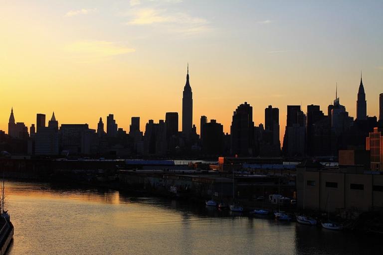 Keywords: city new york skyscraper building sunset evening river skyline view