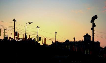 Keywords: city street buildings skyline silhouette soft sunset blushing sky