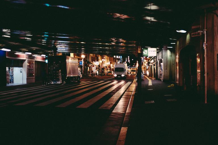 Keywords: city street urban night traffic lights crosswalk zebra crossing underneath bridge road trucks lorries transportation
