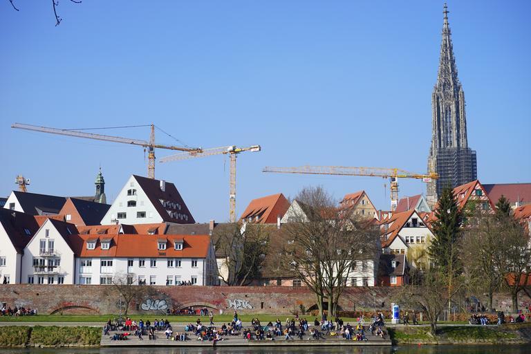 Keywords: city view ulm construction cranes cranes danube site homes river water recovery city life ulm cathedral