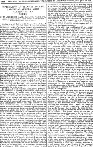Keywords: Civilisation in relation to the abdominal viscera, with remarks on the corset 1.png Civilation in relation to the abdominal viscera The Lancet 1909-11-13 Lane W Arbuthnot PD PD-old Permanent corset treatment