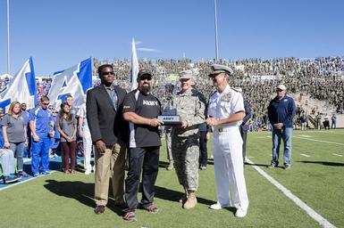 Keywords: CJCS and VCJCS attend Warrior Games Tailgate and AF v Navy football 141004-D-HU462-475.jpg en 18th Chairman of the Joint Chiefs of Staff Gen Martin E Dempsey presents the Chairman's Cup trophy to the Army team captain Frank Barroquiero during halftime at the Air Force versus Navy football game at the U S Air Force Academy's Falcon Stadium in Colorado Springs Colorado Oct 4 2014 DoD photo by Army Staff Sgt Sean K Harp/Released 2014-10-04 Staff Sgt Sean Harp https //www dvidshub net/image/1604926 141004-D-HU462-475 2014-10-08 00 02 UNITED STATES AIR FORCE ACADEMY CO US PD-USGov Martin E Dempsey Falcon Stadium Images from DoD uploaded by Fæ |