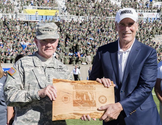 Keywords: CJCS and VCJCS attend Warrior Games Tailgate and AF vs. Navy football 141004-D-HU462-455.jpg en Gen Martin E Dempsey 18th chairman of the Joint Chiefs of Staff presents a plaque to U S Olympic Committee board member James Benson during halftime at the Air Force vs Navy football game at the U S Air Force Academy's Falcon Stadium in Colorado Springs Colo Oct 4 2014 DOD photo by Army Staff Sgt Sean K Harp/Released 2014-10-04 Staff Sgt Sean Harp https //www dvidshub net/image/1604830 141004-D-HU462-455 2014-10-08 00 00 UNITED STATES AIR FORCE ACADEMY CO US PD-USGov Martin E Dempsey Falcon Stadium Images from DoD uploaded by Fæ |