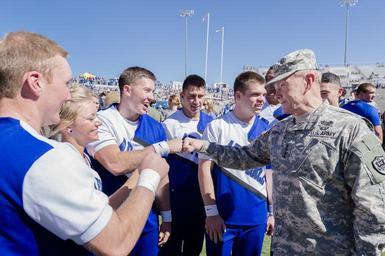 Keywords: CJCS and VCJCS attend Warrior Games Tailgate and AF vs. Navy football 141004-D-HU462-232.jpg en Chairman of the Joint Chiefs of Staff U S Army Gen Martin E Dempsey fist bumps Air Force Academy cheerleaders during the Air Force vs Navy football game at the U S Air Force Academy's Falcon Stadium in Colorado Springs Colo Oct 4 2014 DOD photo by Staff Sgt Sean K Harp U S Army/Released 2014-10-04 Staff Sgt Sean Harp https //www dvidshub net/image/1603434 141004-D-HU462-232 2014-10-07 16 02 UNITED STATES AIR FORCE ACADEMY CO US PD-USGov Martin E Dempsey Falcon Stadium Images from DoD uploaded by Fæ |