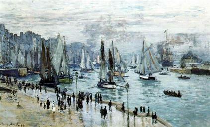 Keywords: Claude Monet, Fishing Boats Leaving the Harbor, Le Havre.jpg Artwork Q2891152 creator Claude Monet 1874 Oil canvas cm 60 101 Private collection object history credit line Claude Monet 74 lower left signature Here Monet has used brush strokes to construct the painting horizontal strokes used to illustrate the movement and light coming off the water Vertical strokes to depict the taller objects i the painting for example the boats and the people he never mixes the two strokes also he uses the occasional complementary colour in the boats and background to bring the painting alive against the cold blues This is a scene of contemporary people a common theame for the impressionists as at the time they were rejected from the art establishment forcing them to exhibit as their own group The conventional 'good' art at the time was featuring a famous or important person and centred around that person so the impressionist were very experimental accession number source PD-old-auto 1926 Oil paintings of ports and harbours Fishing boats in Seine-Maritime Le Havre by Claude Monet Paintings by Claude Monet - year of production missing 1874 paintings 19th-century oil paintings 19th-century paintings in France Paintings of sailboats Fishing boats in art Fishing ships of France |