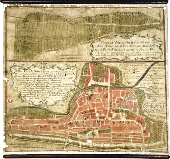 | Keywords: Claudio Martigny - Pianta di Rieti (1725).jpg it Pianta della città di Rieti Lazio realizzata da Claudio Martigny nel 1725 conservata nella sezione storico-artistica del Museo Civico di Rieti Nella parte superiore rappresenta una parte della città dove sono descritte strade vicoli piazze isolati chiese e giardini; nella parte inferiore è indicata l'antica disposizione della città Legenda rosso indica gli isolati e le case; i punti blu e celesti le fontane; il giallo le strutture ecclesiastiche segnalate anche da una croce en Plan of the city of Rieti Lazio Italy drawn in 1725 by Claudio Martigny preserved in the Civic Museum of Rieti 1725 http //www culturalazio it/musei/rieti/argomento1 php id 63 vms 6 vmf 45 page 2 Museo Civico di Rieti Claudio Martigny other versions PD-old-70-1923 Museo Civico di Rieti - Sezione Storico Artistica Maps of Rieti |