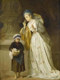 Keywords: Claudius Schraudolph Die kleine Blumenverkäuferin.jpg The little flower seller; signed and dated 'C Schraudolph j 1868' lower left ; oil on canvas; 62 x 46 cm http //www bonhams com/auctions/14978/lot/86/ 1868 Claudius von Schraudolph 1843-1902 PD-old-100 Claudius Schraudolph der Jüngere Flower vendors in art Child labour in art Parasols in art 1868 paintings Rococo revival paintings Images from Bonhams Paintings of girls with baskets