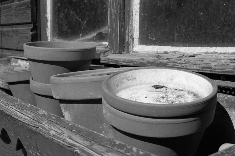 Keywords: clay pots sound flower pots container vessels pots old window window frames frame decay lapsed