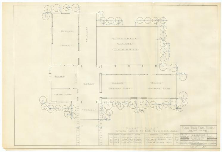 | Keywords: ccc cleburne state park cleburnestatepark civilian conservation corps civilianconservationcorps texas state parks texasstateparks text monochrome writing drawing sketch document Title: Planting Plan Concession Building Specific Date: 1/22/1944 Architect: H., R.J., draftsman Remarks: Pencil, black ink, and colored pencil on paper showing planting plan for concession building, including plant list, floor plan of concession building. Dimensions: LN: 36.25" x WD: 24.375" Title: Planting Plan Concession Building Specific Date: 1/22/1944 Architect: H., R.J., draftsman Remarks: Pencil, black ink, and colored pencil on paper showing planting plan for concession building, including plant list, floor plan of concession building. Dimensions: LN: 36.25" x WD: 24.375" |