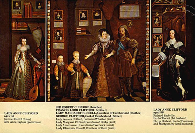 Keywords: Clifford Family.jpg Lady Anne Clifford 1590 ˆ’1676 und ihre Familie Abbot Hall Art Gallery Kendal Cumbria UK Portrait of the family of Anne Clifford Includes her brothers Francis and Sir Robert As well as her father George Clifford and mother Margaret Russell; Abbot Hall Art Gallery Kendal Cumbria UK The Great Picture a huge triptych measuring 8ft 5 high and 16ft 2 wide commissioned in 1646 by Anne Clifford attributed to Jan van Belcamp 1610-1653 formerly hanging in Appleby Castle now displayed in the Abbot Hall Art Gallery Kendal Cumbria It depicts Anne as a girl at left and as a mature woman at right The central panel shows her parents and young brothers The painting is replete with significant elements referring to her life and to her succession to her paternal inheritance gained after a lengthy legal dispute<ref>http //www abbothall org uk/great-picture</ref> http //www tudorplace com ar/Bios/AnneClifford htm ~ 1646 unknown probably Jan van Belcamp PD-Art Nobility of England Portraits with image of family member Family portraits Portrait triptychs Abbot Hall Art Gallery 1646 paintings Jan van Belcamp 17th-century oil on canvas paintings in the United Kingdom |
