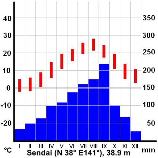Keywords: ClimateSendaiJapan.png Climate diagram of Sendai Japan Map based Image ClimateTemplate PNG Source http //www data jma go jp/obd/stats/etrn/view/nml_sfc_ym php prec_no 34 prec_ch 8B 7B 8F E9 8C A7 block_no 47590 block_ch 90 E5 91 E4 year month day elm normal view JMA data 2007-03-06 own assumed Pekachu Created with Inkscape Climate diagrams of Japan Sendai Miyagi |