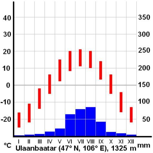 Keywords: ClimateUlaanbaatarMongolia.PNG Climate diagram of Ulaanbaatar Mongolia max and min temperature and total precipitations per month drawn by Miaow Miaow April 2005 2005-04-14 own assumed Miaow Miaow For other images related to this subject see gallery Ulaanbaatar Climate diagrams of Ulan Bator |