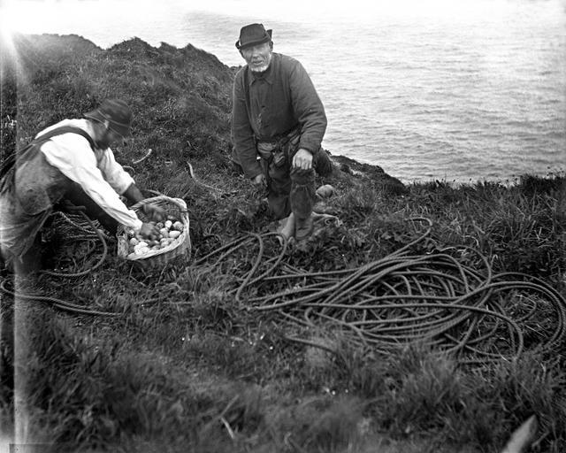 Keywords: Climber giving up his eggs YORYM-S165.jpg Two men on the cliff top The man to the left has a long rope attached presumably around his waist and a large bag slung over his shoulder He is placing eggs in a basket which already contains many eggs He is in shirtsleeves with dark trousers and a curiously shaped hat The other man is watching him and is probably one of the anchor men rather than the actual climber He wears dark clothes with a narrow-brimmed hat depicted people depicted place 1900-1912 glass plate negative 125mm long edge x 100mm short edge institution Yorkshire Museum object history exhibition history credit line accession number YORYM S165 York Museums Trust image PD-old-70-1923 PD-US Images from The Sydney Harold Smith Collection Flamborough Head Bird eggs Cliffs of the East Riding of Yorkshire History of Flamborough Black and white photographs of England Uploaded with UploadWizard |