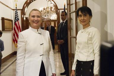 Keywords: Clinton and Aung San Suu Kyi after having dinner.jpg en United States Secretary of State Hillary Clinton meets with Burma's pro-democracy leader Aung San Suu Kyi 2011-12-01 State gov http //www state gov/r/pa/ei/pix/2011/12/177900 htm U S State Department link United States government employees Aung San Suu Kyi Clinton visit 2011 jpg PD-USGov Uploaded with UploadWizard Visit by Hillary Rodham Clinton to Myanmar in 2011 Aung San Suu Kyi Photographs of flags of the United States |