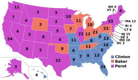 | Keywords: Clinton vs. Baker vs. Perot.svg en Hypothetical 1992 U S Presidential election map pitting Bill Clinton against Howard Baker and Ross Perot File ElectoralCollege1992 svg MB298 2016-12-09 SVG maps by MB298 Fictitious U S presidential election maps |