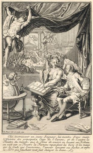 | Keywords: Clio-time-love-fortune-death-picart-1731.jpg en Clio the muse of history instructs a young nobleman The lessons are revealed by Time who pulls back a curtain to show a theater of the past The principals in that scene Love Fortune and Death spread their favors with abandon The image was used as the frontispiece to a 1732 edition of Samuel Pufendorf's Introduction à l'histoire générale et politique de l'univers St John's Univ http //cdm csbsju edu/cdm/ref/collection/ArcaArt/id/9115 Bernard Picart 1731 PD-old-100 PD-1996 Clio Father Time Cupido Fortuna Allegories of death |