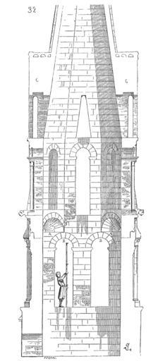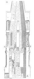 | Keywords: Clocher.Vernouillet.3.png Les clochers centrals du XII<sup>e</sup> siècle sont fort rares dans cette partie de la France dévastée par les guerres de la fin de ce siècle; aussi celui de Vernouillet qui clôt l'époque de transition doit-il être étudié avec attention Il se compose d'une base carrée sans ouverture portant sur les quatre piles de la croisée et sur les quatre arcs doubleaux Le beffroi à jour s'élève sur ce socle; ses angles sont renforcés de colonnes engagées formant contreforts; les quatre faces sont percées chacune de deux baies Viollet-le-Duc Bell Tower Viollet-le-Duc Église Saint-Étienne de Vernouillet |