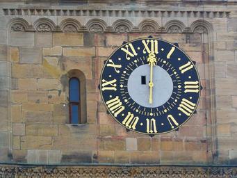 Keywords: clock clock tower clock face time indicating hour architecture building pointer golden church clock historically bamberg movement time of lunch point 12 noon roman numerals sand stone masonry