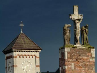 Keywords: clock clock tower time time indicating pointer clock face hour minute tower gold golden church clock time of show hour hand minute hand church cross jesus maria angel brick building architecture thunderstorm gloomy sky