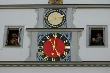 Keywords: clock glockenspiel places of interest ring sound music bimmeln time of tourism housewife architecture building facade window landmark glass tourist attraction glass window historically old high city downtown old town town hall square rothenburg of the deaf marketplace