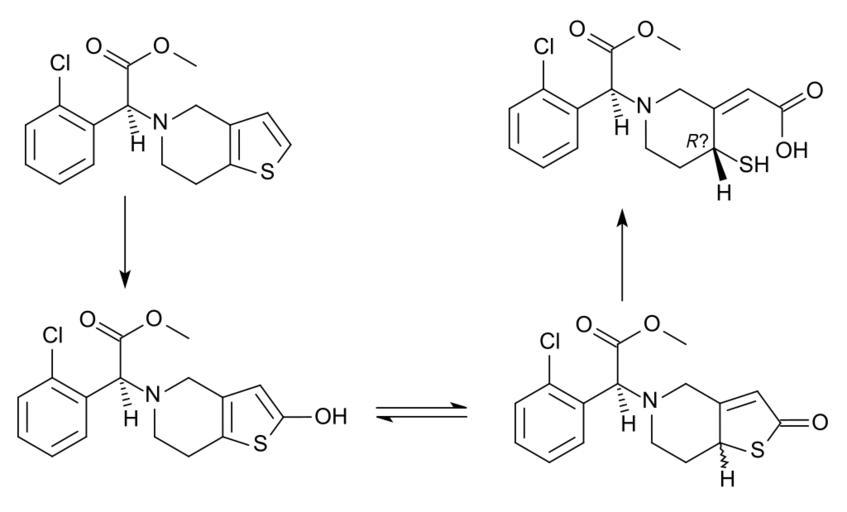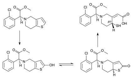 Keywords: Clopidogrel activation.svg Clopidogrel top left being activated The active metabolite top right has Z configuration at the double bond C3 “C16 and possibly R configuration at the newly asymmetric C4 The first step is a cytochrome P450 mediated oxidation; the two structures at the bottom are tautomer s of each other; and the final step is a hydrolysis own based on cite journal Pereillo JM Maftouh M Andrieu A Uzabiaga MF Fedeli O Savi P Pascal M Herbert JM Maffrand JP Picard C 2002 Structure and stereochemistry of the active metabolite of clopidogrel Drug Metab Dispos 30 11 1288 “95 12386137 10 1124/dmd 30 11 1288 http //dmd aspetjournals org/cgi/reprint/30/11/1288 pdf Anypodetos 2011-12-24 BKchem 001 -check Clopidogrel Metabolic pathways Cc-zero |