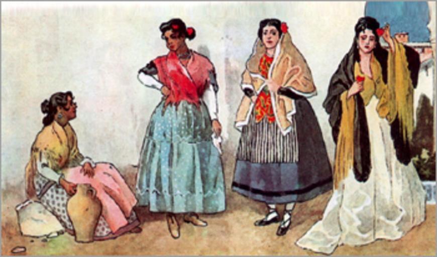 | Keywords: Clothing of Spain Table154-3.jpg Clothing of Spain Gypsy women Испанские цыгане 1 2 Цыганки в п остой ситцевой одежде 3 Сельская жительница 4 Дама в желтой шелковой манильской накидке сколотой на г уди и в к ужевной мантилье В волосах - се еб яный г ебень и цветок г аната History of costume http //silveromsk virtbox ru/moda/index152-2 html century 19 anonimous PD-Art Clothing of Spain Files uploaded by Shakko from various sources | ||||