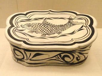 Keywords: Cloud-Shaped Pillow, 12th century, Jin Dynasty, China, cizhou-type ware, stoneware with fish design in underglaze iron-brown paint - Art Institute of Chicago - DSC00275.JPG Exhibit in the Art Institute of Chicago Chicago Illinois USA This artwork is in the public domain because the artist died more than 70 years ago Photography was permitted in the museum without restriction Daderot 2012-10-10 16 40 38 Daderot cc0 cc0 Ceramic pillows in the Art Institute of Chicago |