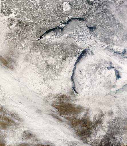 | Keywords: Cloud Streets over the Great Lakes, Natural Hazards DVIDS837587.jpg en Like strokes from an artist's brush the sky over Lake Superior and Lake Michigan was painted with long rows of white clouds on February 5 2007 Called cloud streets these clouds occur when frigid dry air blows across the lake where it picks up water vapor from the warmer lake The water vapor freezes into ice crystals and clouds form The clouds take the shape of the wind as it gusts over the water The same process can also cause lake effect snow or rain when the cold moist air blows ashore on the lee side of the lake Signs of lake effect snow can be seen along the southern shore of Lake Superior which is bright white with little sign of brown vegetation poking through 2011-08-01 https //www dvidshub net/image/837587 837587 2013-02-08 05 52 WASHINGTON D C US PD-USGov Lake Michigan Lake Superior Images from DoD uploaded by Fæ |