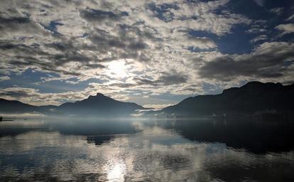 Keywords: clouds sky blue dark clouds clouds form covered sky above the clouds evening sky spotlight landscape lake mirroring water wave nature atmosphere romance romantic weather mood natural atmospheric refraction sun distant view