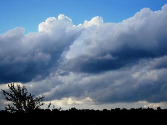 Keywords: clouds swirling rolling diagonal tugging moving tree on horizon blue sky