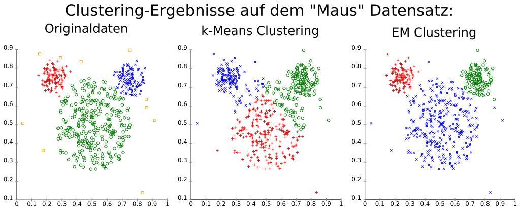 Keywords: ClusterAnalysis Mouse de.svg Cluster analysis performed on an artificial dataset Mouse similar to a well-known comic figure comparing k means and EM clustering results The tendency of k-Means to produce clusters of the same extends produces bad results while the Gaussian nature of the data is well recognized by EM The visualization was generated using ELKI Clusteranalyse auf einem künstlichen Datensatz Maus ähnlich einer bekannten Comic-Figur mit den Algorithmen k-Means und EM Die Tendenz von k-Means cluster gleicher räumlicher Ausdehnung zu produzieren führt zu einem schlechten Ergebnis Der aus Normalverteilungen bestehende Datensatz ist dagegen ideal für EM das die Daten mit Normalverteilungen zu modellieren versucht Visualisiert mit ELKI 2010-10-12 own Chire Other versions ClusterAnalysis Mouse svg Other fields ELKI + Cc-zero Cluster analysis Algorithms |