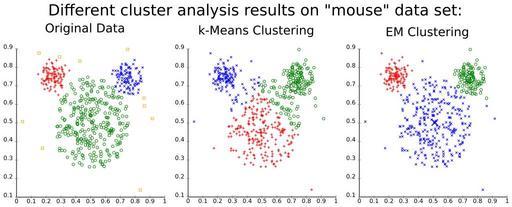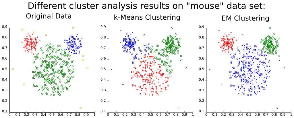 Keywords: ClusterAnalysis Mouse.svg Cluster analysis performed on an artificial dataset Mouse similar to a well-known comic figure comparing k means and EM clustering results The tendency of k-Means to produce clusters of the same extends produces bad results while the Gaussian nature of the data is well recognized by EM The visualization was generated using ELKI Clusteranalyse auf einem künstlichen Datensatz Maus ähnlich einer bekannten Comic-Figur mit den Algorithmen k-Means und EM Die Tendenz von k-Means cluster gleicher räumlicher Ausdehnung zu produzieren führt zu einem schlechten Ergebnis Der aus Normalverteilungen bestehende Datensatz ist dagegen ideal für EM das die Daten mit Normalverteilungen zu modellieren versucht Visualisiert mit ELKI own Chire 2010-10-12 Other fields ELKI + Cluster analysis |