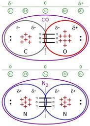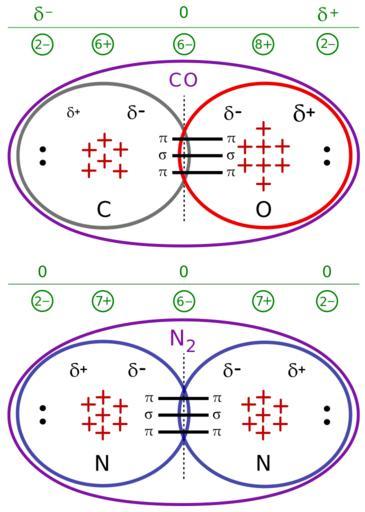 MAKE A MEME View Large Image CO NN-isoelectronic.svg en Isoelectronicity of carbon monoxide and dinitrogen <br /> Model of the molecules of carbon monoxide above and dinitrogen below showing polarized bonds in CO In green the dipolar charges the numbers of valence ...