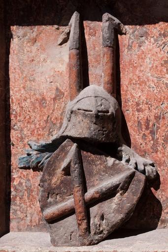 Keywords: coat of arms european tradition hereditary characters shape of a shield person family group of people knightly shield helm knight helmet heraldry rock carving painted old antique