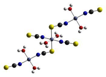 | Keywords: Cobalt(II)-thiocyanate-trihydrate-xtal-1976-Co-coordination-CM-3D-balls.png Ball-and-stick diagram of the coordination geometry and environment of cobalt in the crystal structure of cobalt II thiocyanate trihydrate Co NCS <sub>2</sub>·3H<sub>2</sub>O better described as trans- H<sub>2</sub>O <sub>2</sub>Co NCS <sub>2</sub>·H<sub>2</sub>O Colour code Cobalt Co grey-blue Nitrogen N blue Carbon C black Sulfur S yellow Oxygen O red Hydrogen H white Crystal structure from http //dx doi org/10 1107/S0567740876005694 Acta Cryst 1976 B32 1526-1529 Image generated in http //www crystalmaker com/ CrystalMaker 8 3 Own 2010-08-09 Ben Mills Benjah-bmm27 Images by Ben Mills Ball-and-stick models Cobalt II thiocyanate |