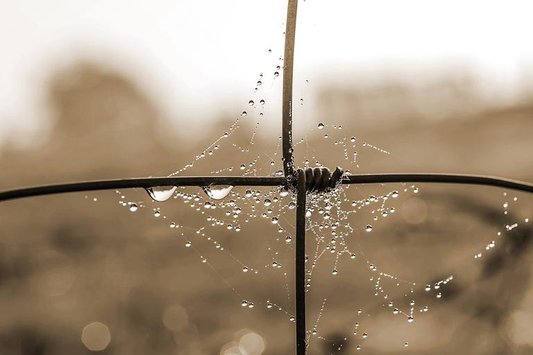 Keywords: cobweb dewdrop raindrop dew drop of water spider web with water beads wire twisted wire beaded morgentau morning dew droplets atmospheric moisture