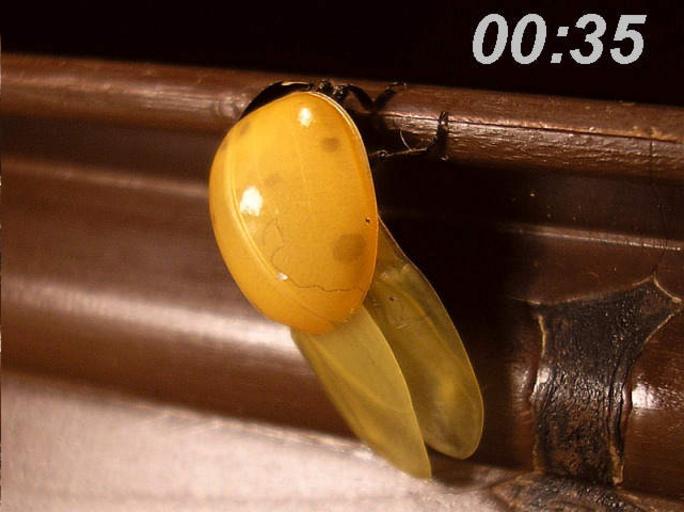| Keywords: Coccinella septempunctata emerging from pupa3.png Seven-spot ladybird Coccinella septempunctata emerging from it's pupa <br>Note that even the elytra need to be pumped up; At first wrinkled and open towards the hind body Around 10 minutes after emergence began they're closed five minutes later they're fully stretched smooth now and the beetle has wandered off to find a spot for pumping up the wings During the pumping of the wings also the colouration of the elytra slowly begins to develop About half a day later the beetle clearly has it's characteristic colours - although still visibly fresh <br>Location Hengelo Overijssel Netherlands<br>Keywords ladybug lady beetle 7-spot<br>See also P4b species page or category Uitsluipen van Zevenstippelig lieveheersbeestje<br>Locatie Hengelo Ov Schlüpfen eines Siebenpunkt-Marienkäfers Coccinella septempunctata Mariquita de siete puntos Coccinella septempunctata Coccinelle à sept points Coccinella septempunctata Coccinella_septempunctata_emerging_from_pupa jpg 2009-12-22 17 26 UTC Coccinella_septempunctata_emerging_from_pupa jpg Pudding4brains derivative work B kimmel <span class signature-talk >talk</span> cutted B kimmel Coccinella_septempunctata_emerging_from_pupa jpg Coccinella septempunctata eclosing from pupa |
