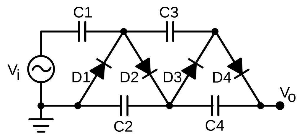 Keywords: Cockcroft Walton voltage multiplier circuit.svg Cockcroft-Walton voltage multiplier circuit also called the Greinacher multiplier When an alternating voltage is applied it produces a DC output voltage equal to V<sub>o</sub> 2NV<sub>p</sub> NV<sub>pp</sub> where V<sub>pp</sub> is the peak-to-peak input voltage and N is the number of stages This diagram shows a 2 stage circuit with output V<sub>o</sub> 4V<sub>ip</sub> It was invented in 1932 by physicists John Douglas Cockcroft and Ernest Thomas Sinton Walton The Cockcroft-Walton circuit is widely used to produce high voltages in CRT television set anode supplies photomultiplier tube power supplies copiers laser printers electrostatic precipitators and Cockcroft-Walton particle accelerators 2015-04-12 own Chetvorno other versions cc-zero Uploaded with UploadWizard Cockcroft-Walton generators |