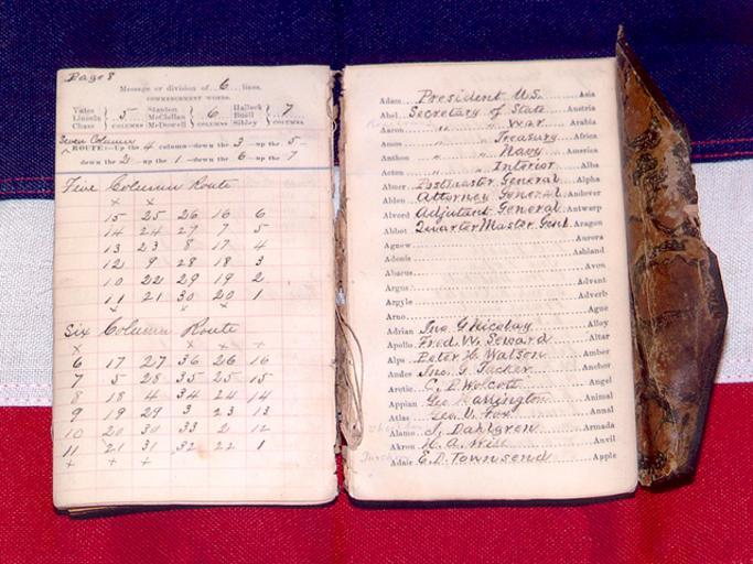 | Keywords: Codebook.jpg A picture of a codebook for telegraphic correspondence from english Wikipedia Union codebook; pic from NSA museum PD-USGov-NSA PD-USGov English Wikipedia History 02 22 25 June 2004 Matt Crypto 640×480 446 KB same name Codebooks Books and manuscripts in the National Cryptologic Museum |