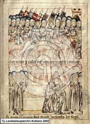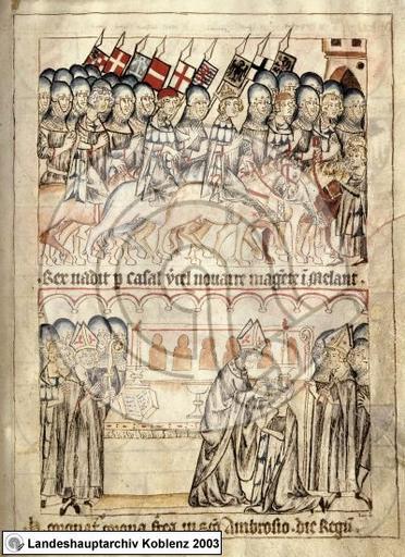 Keywords: Codex Balduineus-folio-9.jpg en Codex Balduineus or Kaiser Heinrichs Romfahrt folio 9 Flags displayed from left to right County of Sponheim<ref>Kaiser Heinrichs Romfahrt Die Bilderchronik von Kaiser Heinrich VII und Kurfürst Balduin von Luxemburg 1308-1313 Herausgegeben von Franz-Josef Heyen ISBN 3-423-01358-3</ref> Savoy Hohenfels-Reipoltskirchen Palatinate Austria Electorate of Trier House of Luxembourg King's arms HRE Teutonic Order Flanders de Kaiser Heinrichs Romfahrt Folio 9 Gezeigte Fahnen von links nach rechts de Grafschaft Sponheim de Savoyen Hohenfels-Reipoltskirchen Pfalz de Österreich de Kurfürstentum Trier de Haus Luxemburg Königswappen HRR Deutscher Ritterorden de Flandern REX VADIT PER CASAL VERCEL NOVAIRE MAGENTE IN MELANT Der König zieht über Casale Vercelli Novara und Magenta nach Mailand HENRICUS CORONATUR CORONA FERREA IN SANCTO AMBROSIO DIE REGUM Heinrich wird in S Ambrosio am Tage der drei Könige mit der eisernen Krone gekrönt Am 23 Dezember 1310 erfolgt der feierliche Einritt in Mailand Mit großem Gefolge zieht der König in die Stadt ein vor deren Toren ihn die Bürger begrüßen Am Dreikönigstag dem 6 Januar 1311 wird Heinrich mit der eisernen Krone zum König von Italien gekrönt Da die Krone der Langobarden trotz langer Suche nicht mehr gefunden werden konnte ließ Heinrich eine neue in Fom eines Lorbeerkranzes anfertigen Tafel 6 entspricht Folio 9 der Bilderhandschrift http //www landeshauptarchiv-ko de/ausstellung/virtuell/full_teil1 html Unknown Under request of Baldwin of Luxembourg Auftraggeber de Balduin von Luxemburg ~ 1340 PD-old References <references/> County of Sponheim Teutonic Knights |