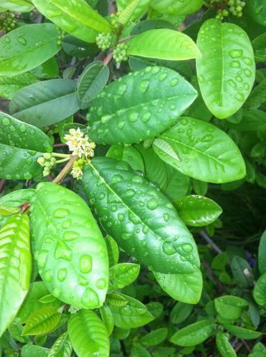 Keywords: coffeeberry blossom flower buds plant leaves rain soaked drops droplet gardens gardening green