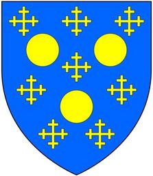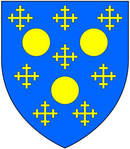 Keywords: CoffinOfMonkleighArms.PNG en Arms of Coffin family of Porthledge in the parish of Alwington and of Monkleigh Devon Azure three bezants between eight crosses crosslet or As seen on 16th century Coffin mural monument in Monkleigh Church Given incorrectly in Vivian Heraldic Visitations of Devon 1895 p 208 as nine crosses crosslet own Lobsterthermidor <span class signature-talk >talk</span> 01 00 23 June 2013 UTC 2013 Monkleigh Coffin arms |