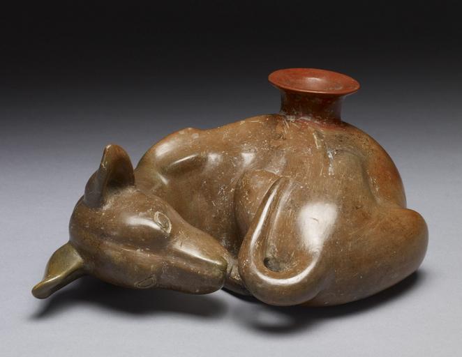 | Keywords: Colima - Dog Effigy Vessel - Walters 20092063 - View A.jpg Among the Mexica Aztecs of highland Mexico dogs were associated with the deity Xolotl the god of death This deity and a dog were believed to lead the soul on its journey to the underworld The Mexica also associated Xolotl with the planet Venus as the evening star portrayed with the head of a canine and the twin brother of the deity Quetzalcóatl who personified Venus as the morning star The dog's special relationship with humans is highlighted by a number of Colima dog effigies wearing humanoid masks This curious effigy type has been interpreted as a shamanic transformation image or as a reference to the modern Huichol myth of the origin of the first wife who was transformed from a dog into a human However recent scholarship suggests a new explanation of these sculptures as the depiction of the animal's tonalli its inner essence which is made manifest by being given human form via the mask The use of the human face to make reference to an object's or animal's inner spirit is found in the artworks of many ancient cultures of the Americas from the Inuit of Alaska and northern Canada to peoples in Argentina and Chile The reclining dog has seemingly just woken slightly raising its head and perking up its ears in reaction to whatever disturbed its slumber The artist skillfully modeled its body especially the muscles and skeletal features 100 BC-AD 300 earthenware burnished slip paint in red and light brown H 5 5/8 x L 12 3/16 x W 10 15/16 in 14 3 x 30 9 x 27 8 cm accession number 2009 20 63 80218 David Stuart Gallelries date and mode of acquisition unknown John G Bourne 1980s by purchase Walters Art Museum Gift of John Bourne 2009 place of origin Colima Mexico Walters Art Museum license Objects from Colima in the Walters Art Museum Media contributed by the Walters Art Museum needs category review Dogs in Pre-Columbian art |